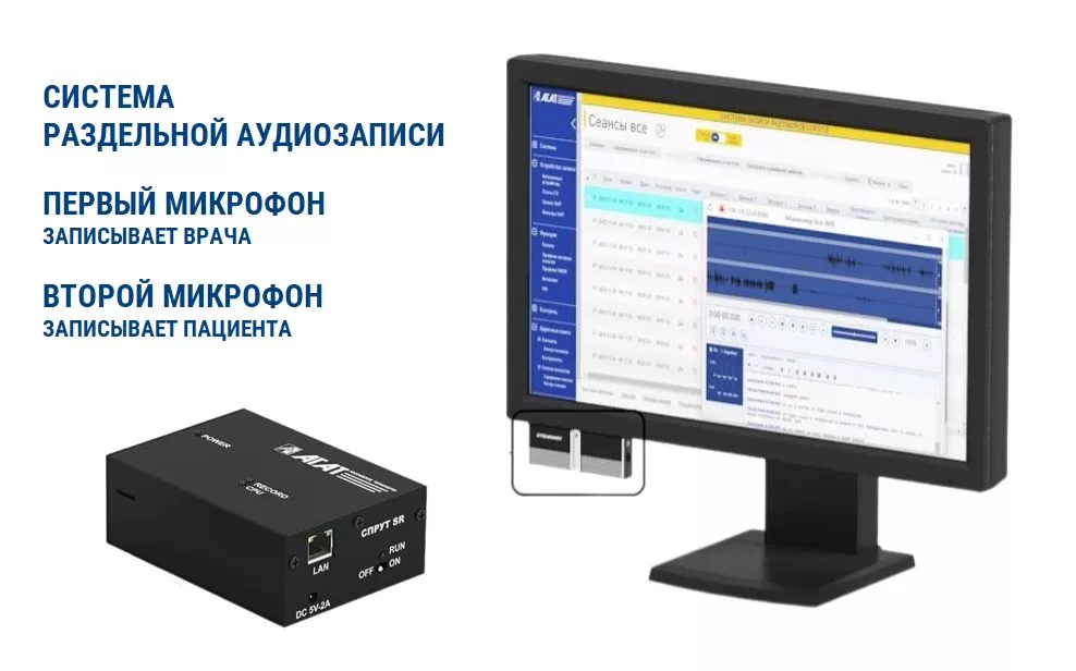 Комплект оборудования для совместной аудиозаписи разговора врача и пациента состоит из сетевого аудиорегистратора СПРУТ и 4-х двунаправленных микрофонов Stelberry MX-1181.